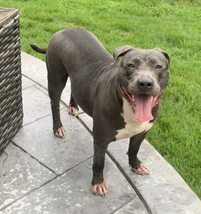 Alamo (‘MoMo’) is a sweet, young, energetic American Bulldog with a lot of love to give. She enjoys time in a fenced in yard doing zoomies, sniffing & exploring her surroundings. She also loves her Kong toy, rope/squeaky pull toys & playing tug any chance she gets. She has a grey and white coat & is 4 years/11 months old. She would thrive in a home experienced with bully breeds & as an only dog. She is trained to sit before eating meals or taking treats. She is housebroken & takes care of her business in the yard. At 74 lbs, she needs a strong leader/capable handler on walks. She is responding well to training that would be best continued in her new home. She is spayed, microchipped, & up to date on all vaccines/veterinary care.  Flea/tick/heartworm prevention is via Simparica Trio.  Her previous owner noted she had past issues with allergies, now resolved with meds and a limited ingredient diet (Simply Nourish Salmon & Sweet Potato Adult Large Breed from Petsmart).  Alamo loves to snuggle at night with her human…will you be her cuddle-bug? 🙂