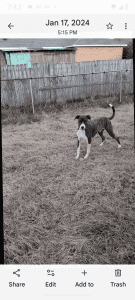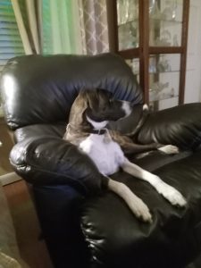 My husband and I, who has since passed away adopted him from the Humane Society when he was four months old. I named him Camo because he looks like he's camouflaged. He is a really beautiful dark brindle and white. He is the most loving dog. He will let you hug and kiss him as long as you want. He loves to be outside but inside he's just a sofa pig. I just have him on Ultra Guard for fleas because I can't afford anything else. He really needs a good home!