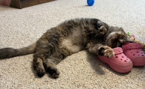 She is currently eating a prescription GI diet to manage tummy upset. She has been indoor only for the last 4 years and enjoys soaking up sun through windows, afternoon play time, and lap kitty status.