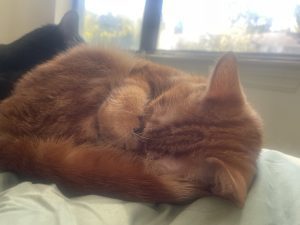 Our new home is not pet friendly, unfortunately. there’s an area where she is able to run outside but we live on a busy road and we figure she might get hit by a car Someday. I’d rather she live a happy long life as much as I love and will miss the silly girl. Miss Freya is a year old and is very sweet and attention driven. She will not go to sleep unless you cuddle. her way of showing affection is licks and kisses. She knows and loves to climb on your shoulder and give kisses(if nails are properly kept She’s learned to minimize claw use while on your shoulder) she will not randomly climb you she very cutely asked for upies. Her favorite toy is a cheap Walmart mouse. She will go crazy for it or the dollar store cat toys she loves a good feathered handheld toy. is good outdoors, She prefers to be at home I would have loved to keep her as an inside-outside cat but the busy road does not allow it. she is on flea prevention. Will miss her dearly, but I want her to live.