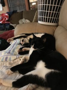 tuxedo, black with white feet, white face and chest with a little black goatee, domestic short hair.