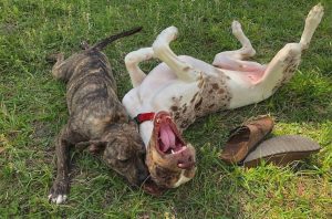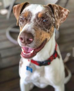 Kylo is a Catahoula Leopard Dog and is about 6 years old. He is deaf but knows hand signals (sit, stay, come, shake). He grew up with lots of other dogs so does super well with other dogs, he also has been around cats and he does great but mostly just ignores them. He was also raised with a baby to a toddler so he’s great with kids!
