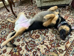 He is well cared for and has a good routine. He eats two meals a day and is trained to use artificial grass for potty needs. At night, he sleeps quietly in his large crate and goes in on command when told, “Go to sleep.”