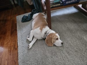 We found Lucky on the side of the road in December of 2024. He was immediately friendly and is still the biggest sweetie. We have two cats that unfortunately he does not get along with, so we are looking for a more suitable family for him. It's been a joy taking care of him while we can, and we'd love to find a place where he can thrive. He LOVES other dogs and has only been around a couple children, but he loved them, too. He's got all the beagle classics: loves to bark, sniff, and snore on the couch.
