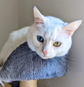 We think she is about 10 years old. Like most cats she snuggles on her own terms. She gets along fine with my two dogs as long as they don't get to excited with her. She would like to be an indoor/outdoor cat but that's not feasible in where I live. She was my daughter's cat and my daughter has moved out and cannot take her with her. I am unsure about her vaccination record. She is completely white with two different colored eyes.