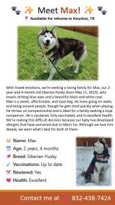If you or someone you know can offer Max a loving and caring home, please contact me at π 832-438-7424.