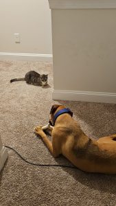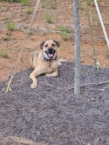 Monty is a loving 65lb 2.5 year old dog. He loves to be affectionate and lick. He loves being outside, racing, exploring the woods, wrestling with other dogs, playing tug of war, and eating peanut butter. He gets very excited and jumps when he sees people he likes. He loves to chew, we always have multiple rawhides around for him. Familiar with shock collar. Listens relatively well to boundaries and stays with his owner in yard. He does have some separation anxiety but can usually be calmed pretty quickly. He is crate trained and can tolerate multiple hours in the crate. He has all of his vaccines, neutered, flea/tick/heartworm monthly prevention, tolerates tub baths well, no know illnesses. He deserves a loving home that will give him plenty of exercise, outside play, love and attention. He is one of the sweetest boys you will meet and will be your best friend.