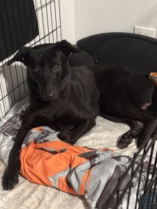 His mom is a Labrador Retriever, and he’s believed to be mixed with Belgian Malinois or possibly German Shepherd. He’s not a black Lab even though he looks like it.