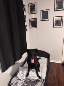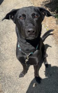 His mom is a Labrador Retriever, and he’s believed to be mixed with Belgian Malinois or possibly German Shepherd. He’s not a black Lab even though he looks like it.
