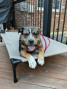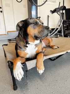 If you want to workout at your house, have a fire outside or whatever it may be he enjoys laying on his elevated cots all you gotta say is PJ place and point. He knows his commands.