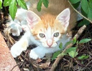 This is Singtat. He is an orange and white domestic short hair. He already has orange eyes that match his fur. He was part of a litter of 4 kittens born after the owner left the mother behind when the moved out. His little family has been cared for by neighbors and the property owners. He is very soft and playful. He loves to play with his siblings and create adventures in his environment. He is a little bit bigger than his siblings and has big paws. He might become a big cat. The new owners have been teaching him and his family to use a litter box successfully. They have lived thier whole lives outside but would love to be indoor kitties. He is waiting to get a little bit older so that he can get vaccinated and neutered. He has been flea treated. He is excited to find his forever home.