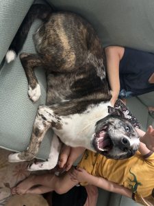 Storm is great with kids and other dogs. He likes cats but will chase if they run, so he does best with confident cats or in a home without them.