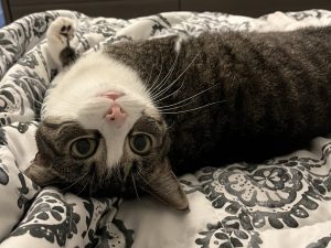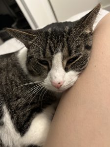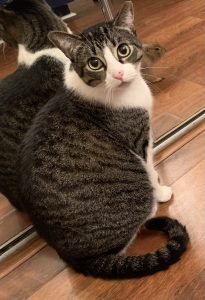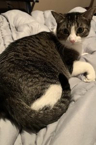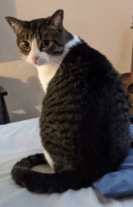 Tulip aka Kitty is a nice, quiet cat. She mainly stays in one area of the home, but will usually come out to greet guests by rubbing her body across their legs. She has no behavioral problems. We only need to rehome her because we are about to have a baby in about a week, and she has fleas, so we need to move her urgently to also clean the environment and not risk the baby’s health.