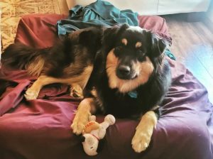 Wrenfri does well with most any situation given enough time to warm up. She's very loyal and very protective of her humans, so strangers will also need to give her time to get to know them. Given the opportunity, she loves playing with other dogs if everyone is in a neutral zone. There are deer that roam around our house, and so she barks to scare them off to protect her property. She's food driven and will growl at other animals approaching her bowl. We have a cat and a 10 lb rat terrier that play with her occasionally. She loves chasing her toys outside but has a thick coat and is prone to overheating during the summer, so we're sure to offer her lots of water.